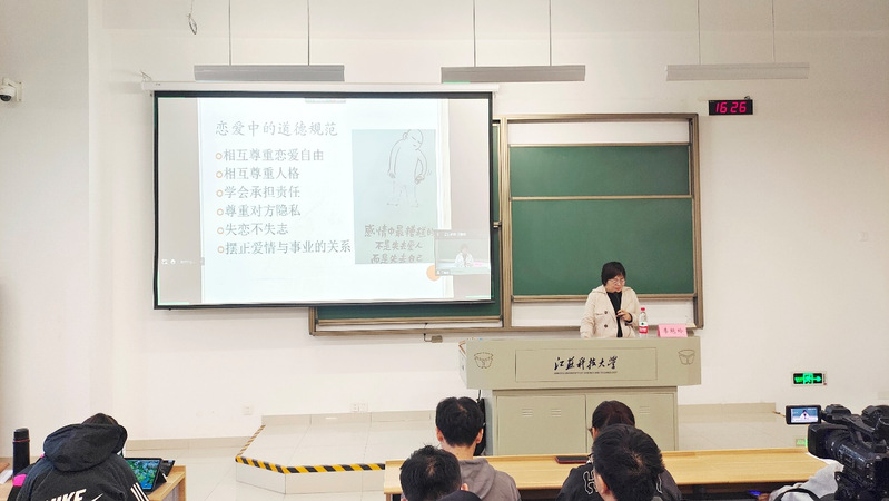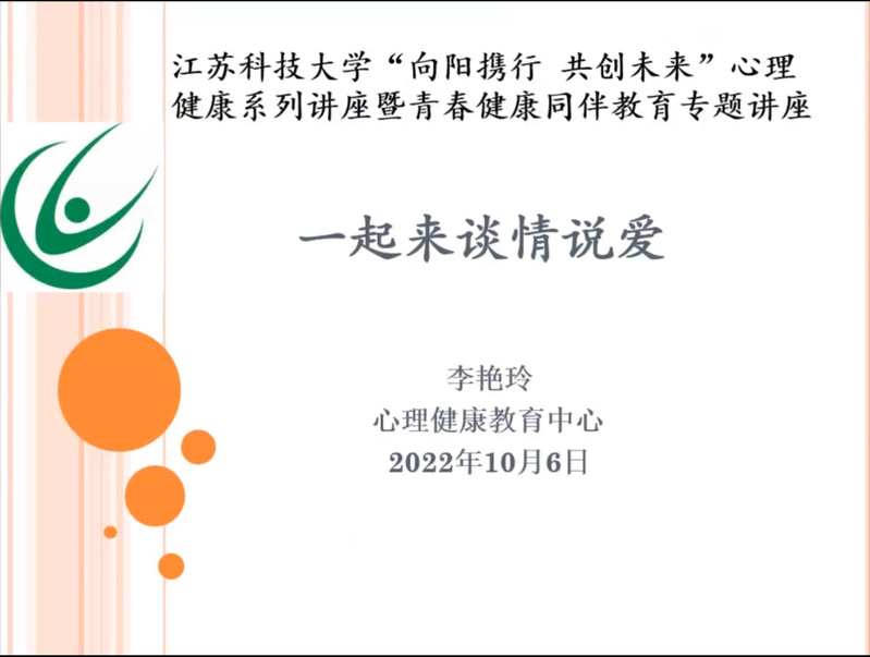 10月6日下午15:30,由江苏科技大学心理健康教育中心、江苏科技大学188金宝搏官方网址主办的“向阳携行,共创未来”心理健康教育系列讲座在笃学楼108教室顺利开展。本次讲座通过线上线下相结合的形式,邀请校心理健康教育中心专职教师李艳玲老师进行《略谈大学生情感》主题宣讲,旨在帮助学生明确恋爱观,普及性爱安全知识。会议由188金宝搏官方网址心理辅导员刘宝达老师主持,各班级同学近200人参加。