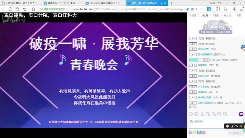 此次晚会所有节目都诚意满满,出现在屏幕上的节目都是经过很多次排练的,感谢所有为本次晚会付出的人。 因为是第一次采取线上直播的形式,所以我们也感到十分的忐忑,不知道会不会不符合大家的胃口,所幸不负众望,这次活动反响很好。 再次感谢各位在期末考试复习阶段能够抽出时间,前来观看我们这次线上直播的晚会,弹幕区一篇热闹,直播间人气高涨,这场晚会,是大家的晚会,也算是一场成功的晚会。千言万语,还是要说一句:感谢所有参与者,最后,希望所有人能够在接下来的期末考试中取得优秀的成绩,加油!!!