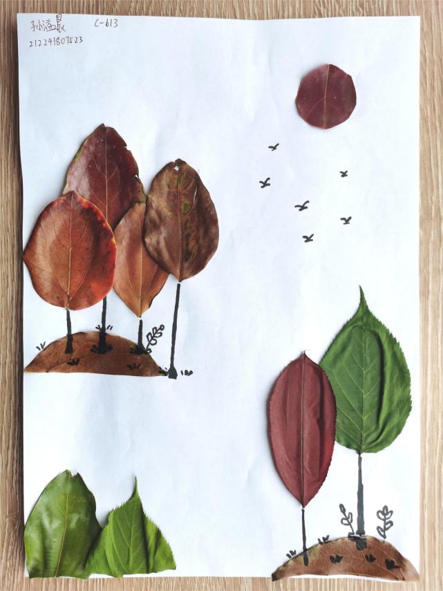 “江南无所有,聊赠一枝春”,片片树叶离开了树枝的“牵挂”,飘落在地,被捡起,通过粘、剪、画、文字相结合的方法创造出了一幅幅精美的树叶粘贴画。作品材料以落叶为主,学生根据树叶本身的颜色以及形状特点,创作出一件件意蕴绵长的作品,有栩栩如生的动植物、惟妙惟肖的人物、也有美不胜收的景物。