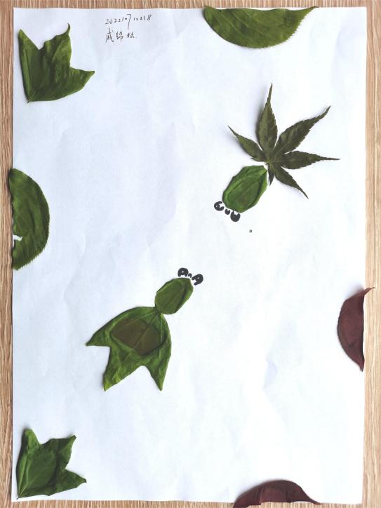 李昊骏、林嘉辉、李林昊同样也是金鱼主题的作品,他们利用不同颜色的落叶将金鱼点缀的更加丰富多彩,充满活力,别具一格。