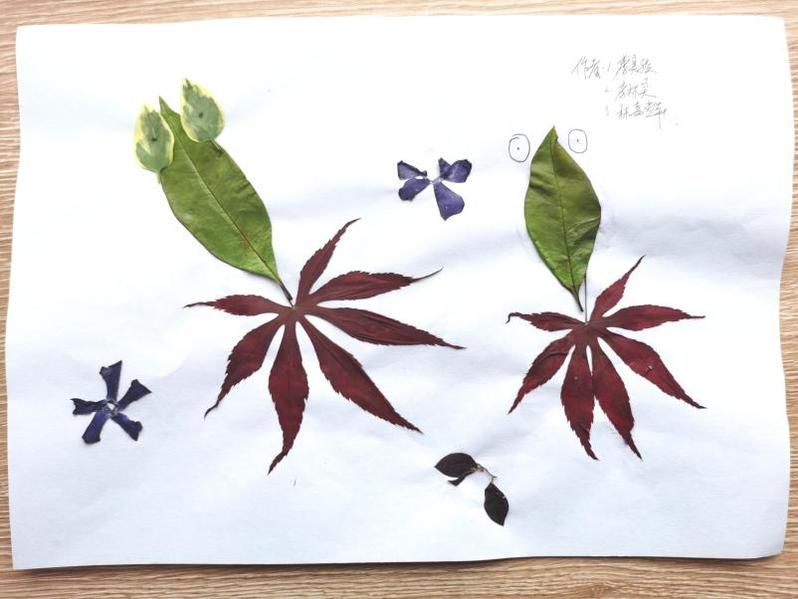 “江南无所有,聊赠一枝春”,片片树叶离开了树枝的“牵挂”,飘落在地,被捡起,通过粘、剪、画、文字相结合的方法创造出了一幅幅精美的树叶粘贴画。作品材料以落叶为主,学生根据树叶本身的颜色以及形状特点,创作出一件件意蕴绵长的作品,有栩栩如生的动植物、惟妙惟肖的人物、也有美不胜收的景物。
