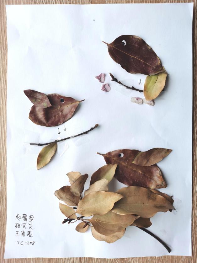 赵馨哲,张笑笑、王紫墨保留落叶的自然形态,通过简单的拼接,勾勒出三只小鸟,相互应和,充满童真童趣,在大学生中少有这种心性。