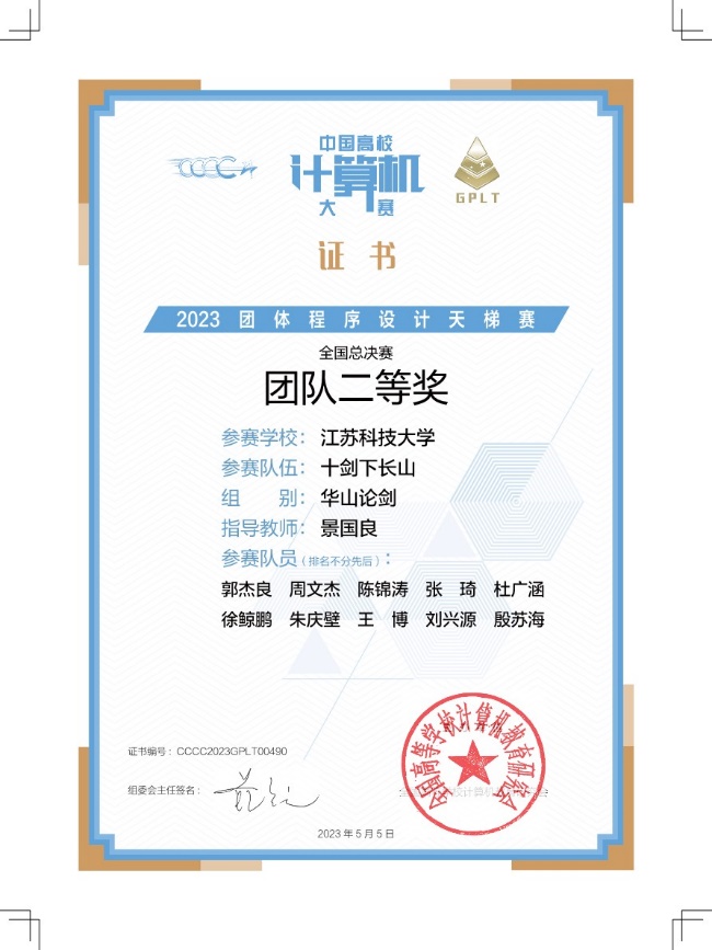 近日,第八届中国高校计算机团体程序设计天梯赛全国总决赛落下帷幕。来自全国31个省份的480所高校组成的1624支队伍共16167位学生同场竞技,双一流高校悉数参加。我校由188金宝搏官方网址郭杰良、周文杰、陈锦涛、张琦、杜广涵、徐鲸鹏、朱庆壁、王博、刘兴源、殷苏海10名同学组成的“十剑下长山”代表队在教练景国良老师指导和带领下戒骄戒躁,勇于拼搏,最终勇夺全国总决赛银奖,并首次获得江苏省金奖。
