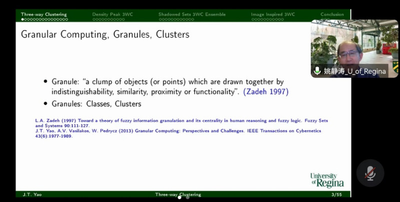 加拿大Regina大学姚静涛教授作了题为“Recent Development of Three-way Clustering”的研讨会报告,三支聚类是一种基于三支决策的高级软聚类方法,本次报告中回顾并介绍了三支聚类技术的最新发展。