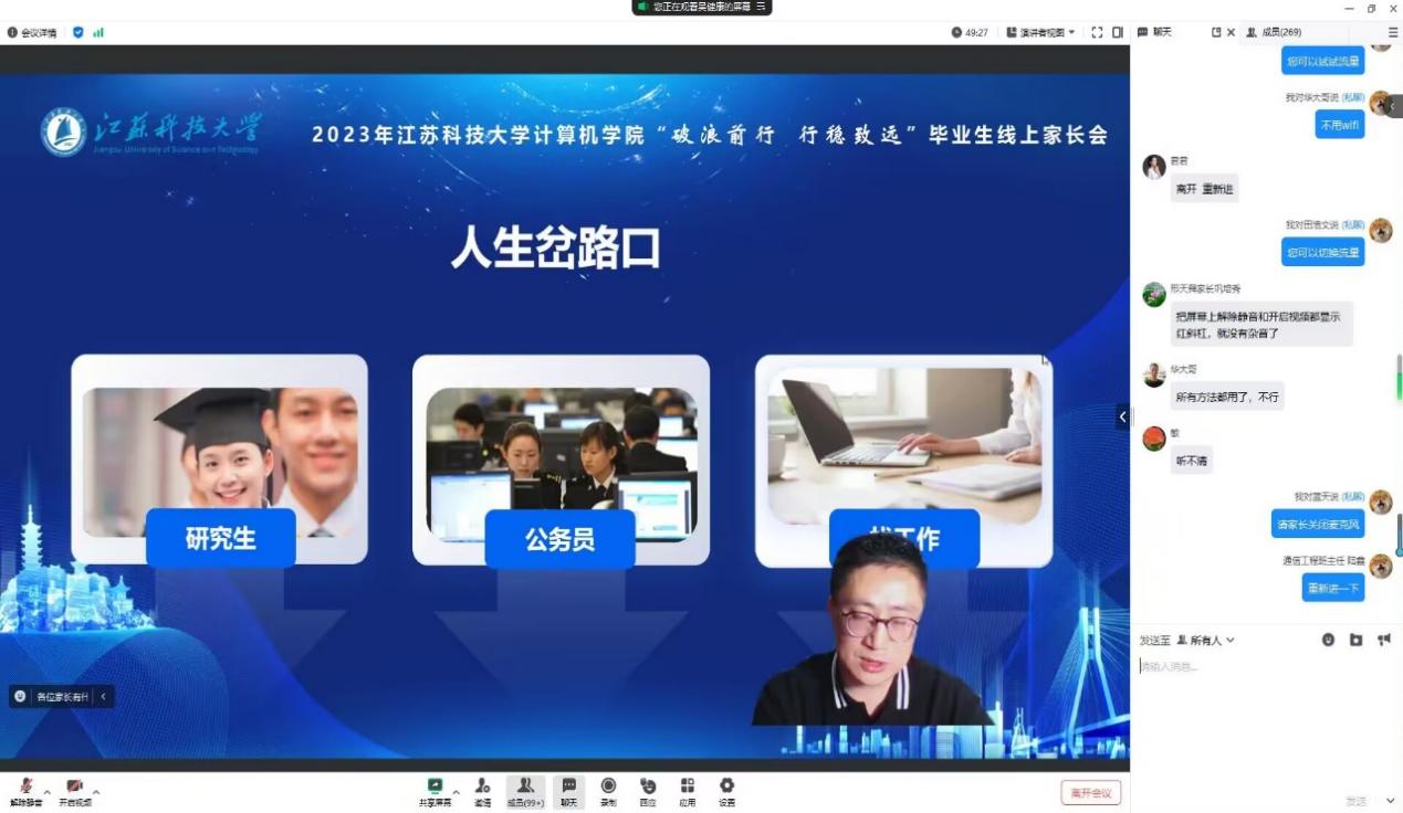 最后,问答环节中吴健康与家长们深入沟通,耐心解答家长们提出的问题。通过交流与讨论,毕业生家长进一步了解了学校的教育理念和就业工作,能够更加认识到毕业生目前面临的机遇与挑战。家长们纷纷表示,将更加支持学校的工作,携手共育,助力孩子成长成才。