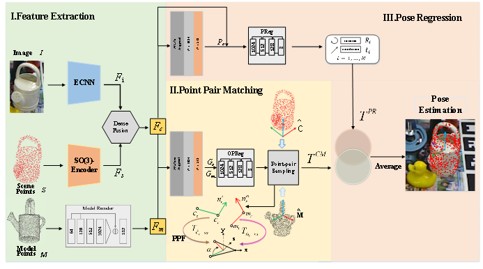6D位姿估计是指从图像中预测物体的位置和方向,这项技术广泛应用于机器人抓取、增强现实和自动驾驶等领域。本文为了鲁棒地估计出复杂场景下被遮挡物体的6D位姿,提出了一种基于高效特征提取,点对特征匹配的鲁棒6D位姿估计方法。具体来说,首先,该研究提出了二维特征提取模块(ECNN)和点云特征提取模块(SO(3)-Encoder),分别从RGB图像中提取二维特征,从深度图像中提取SO(3)等变特征,这些特征在DenseFusion模块中融合,以获得相机空间中的三维特征;同时,利用CAD先验模型,通过输入模型特征编码器得到模型空间下的三维特征。然后,通过对相机和模型空间中的三维特征进行全局回归,分别生成对应的定向点云并进行点对特征匹配,得到点对匹配姿态信息。最后,对相机和模型空间下的三维特征进行直接姿态回归,将得到的点对特征匹配的位姿信息与直接回归的位姿信息相结合,以提高位姿预测的准确性。该研究提出的方法在YCB-Video,LineMOD和Occlusion LineMOD三个基准数据集上都达到了最先进的性能,尤其是在具有挑战性的Occlusion LineMOD数据集上,达到了74.9%的准确率。