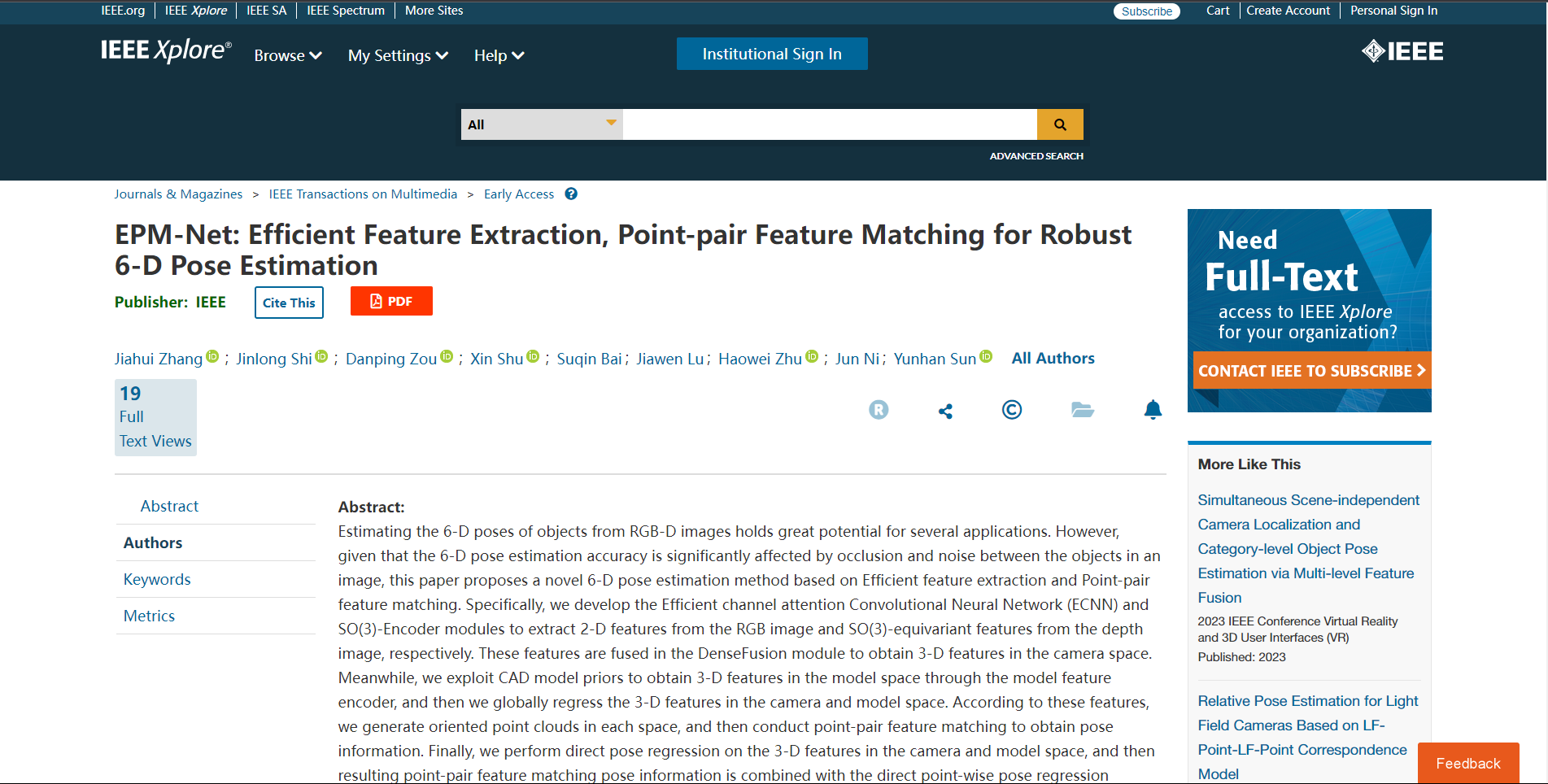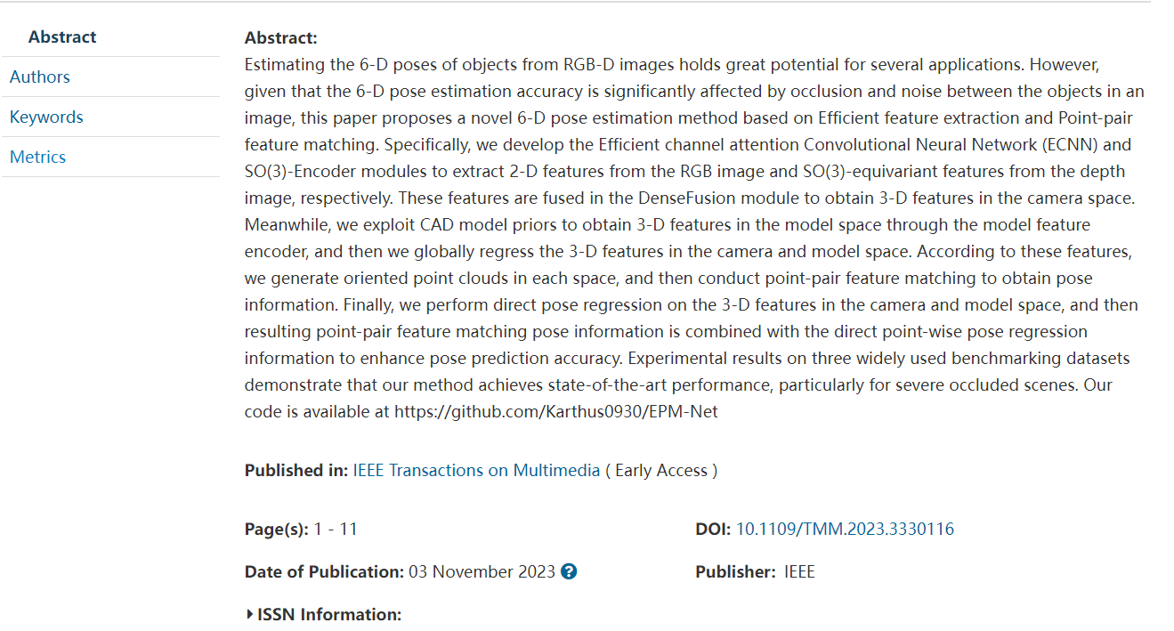 近日,我校188金宝搏官方网址2021级硕士研究生张家辉以第一作者,史金龙教授为通讯作者,在多媒体TOP期刊IEEE TRANSACTIONS ON MULTIMEDIA上发表了题为“EPM-Net: Efficient Feature Extraction, Point-pair Feature Matching for Robust 6-D Pose Estimation”的高水平学术论文。