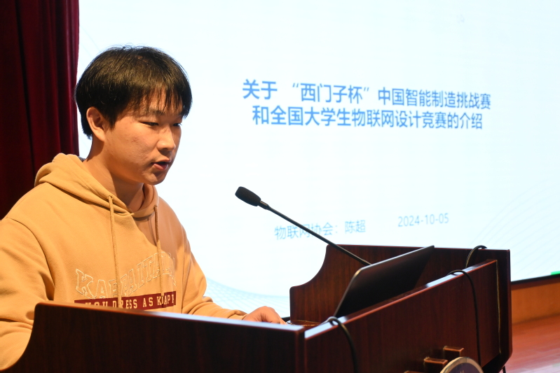 在热烈的氛围中,物联网协会会长陈超同学随后登台。他满怀激情地向大家介绍了两项重要赛事——“西门子杯”中国智能制造挑战赛和全国大学生物联网设计竞赛。陈超学长敏锐地察觉到新生们因担心自身编程能力不足而对参赛望而却步的心理,为同学们解开了心结。他指出,参与竞赛并非完全取决于超强的个人能力,更关键的是团队协作精神和强大的抗压能力。只要能与团队成员紧密协作,在竞赛中取得佳绩并非遥不可及。此外,物联网协会正积极投身于各项赛事。陈超学长诚挚地邀请每一位有潜力为竞赛注入新活力的同学加入协会,大家携手共进,书写属于自己的竞赛篇章。