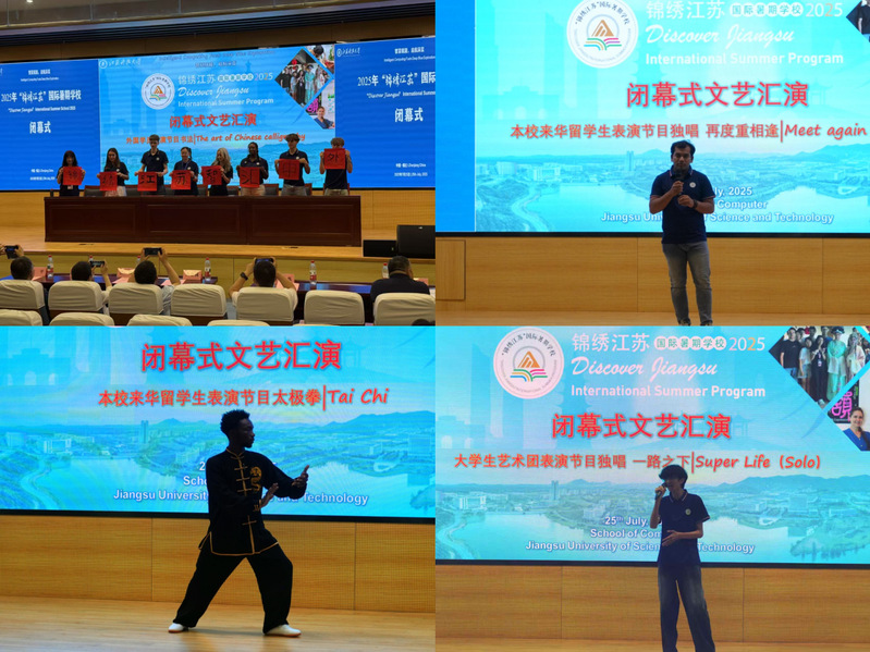 颁奖和发言环节后,参加此次国际暑期学校的中外学员和江苏科技大学大学生艺术团的团员向与会嘉宾和师生呈现了精彩的文艺汇演。法国学员们集体表演的中国书法“锦绣江苏 智汇中外”引来场内一阵阵掌声,我校留学生Thouhedul Islam Rafi演唱的歌曲《再度重相逢》,我校留学生Franck Rooswelt Tegang Sadeffo表演的太极拳有模有样,让观众连连竖起大拇哥。中国学员郑飒带来的歌曲《一路之下》引得台下的观众阵阵欢呼。